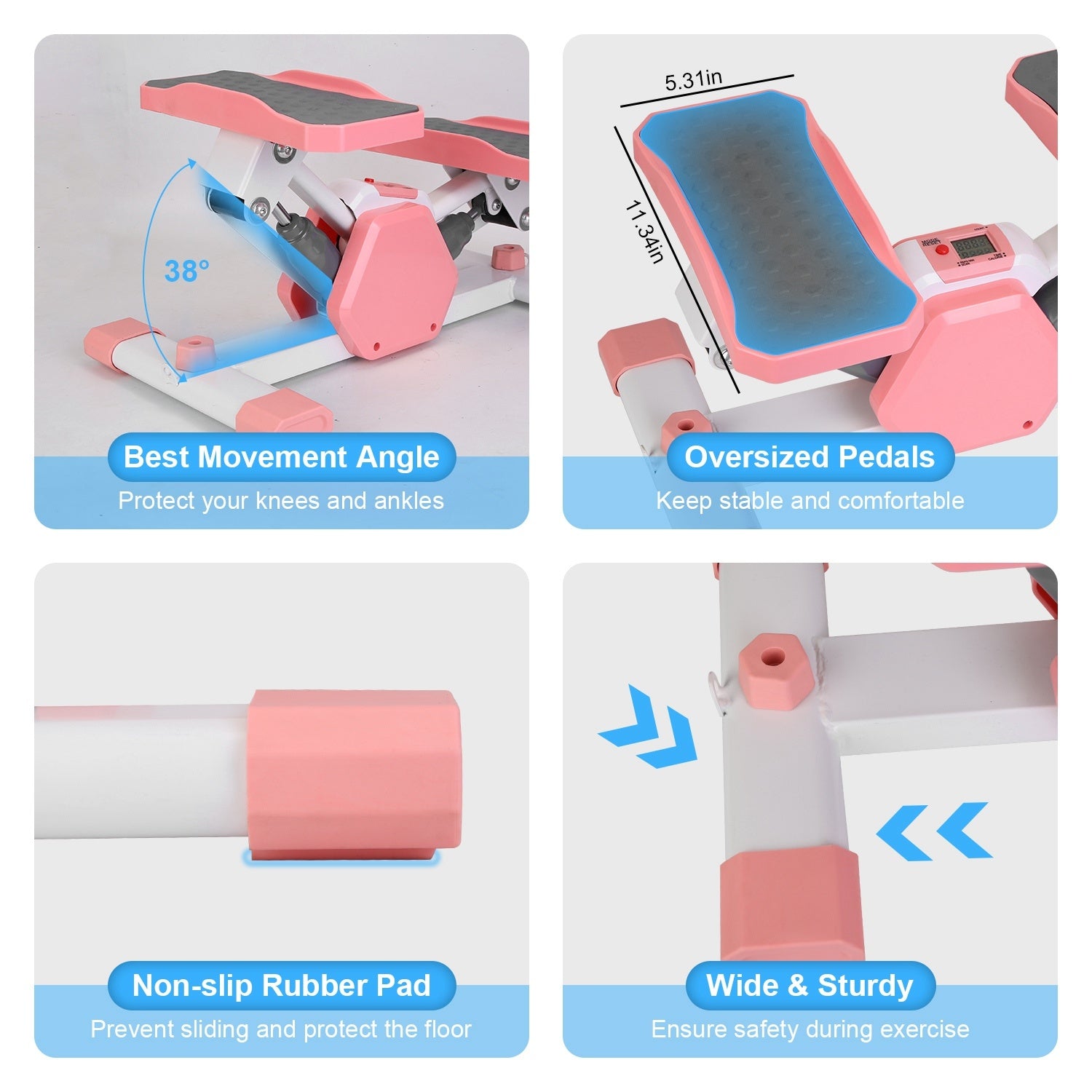 The non-slip pad keeps the exercise stepper stable during workout. Also,you can rotate the 2 mute columns on both sides of our workout stepper for quiet operation. The oversized pedals provide a wider surface area for your feet,preventing foot slippage and increasing comfort during longer workouts.